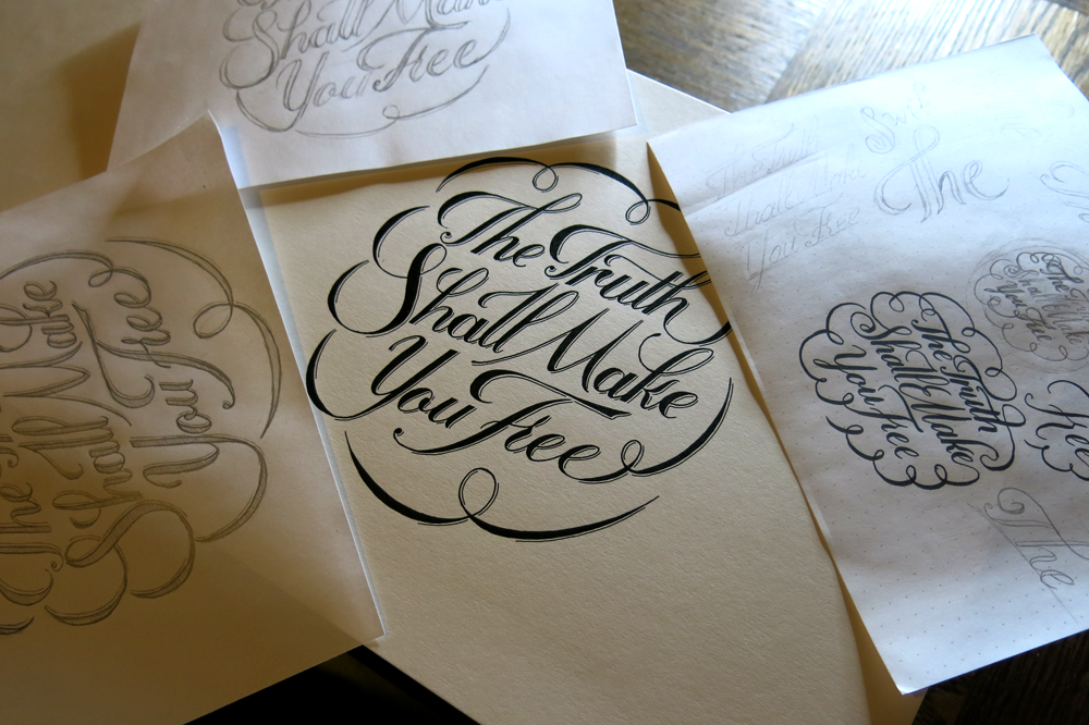I recently became a mod over at /r/lettering, and seeing the quite frequent posts asking for advice for how to begin, I was thinking that I might post a blog post soon that is aimed towards providing some insight into the process. I usually make some comments about what happened on the way to each piece, but a more general tutorial might be a good place to direct people who are looking for some window to how to go from a blank piece of paper to a finished piece. Above, you can see a little bit of what went into designing this piece from initial sketches to trying out some ligatures for the word “The” to making a full pencil sketch to see how it would look at the right size.