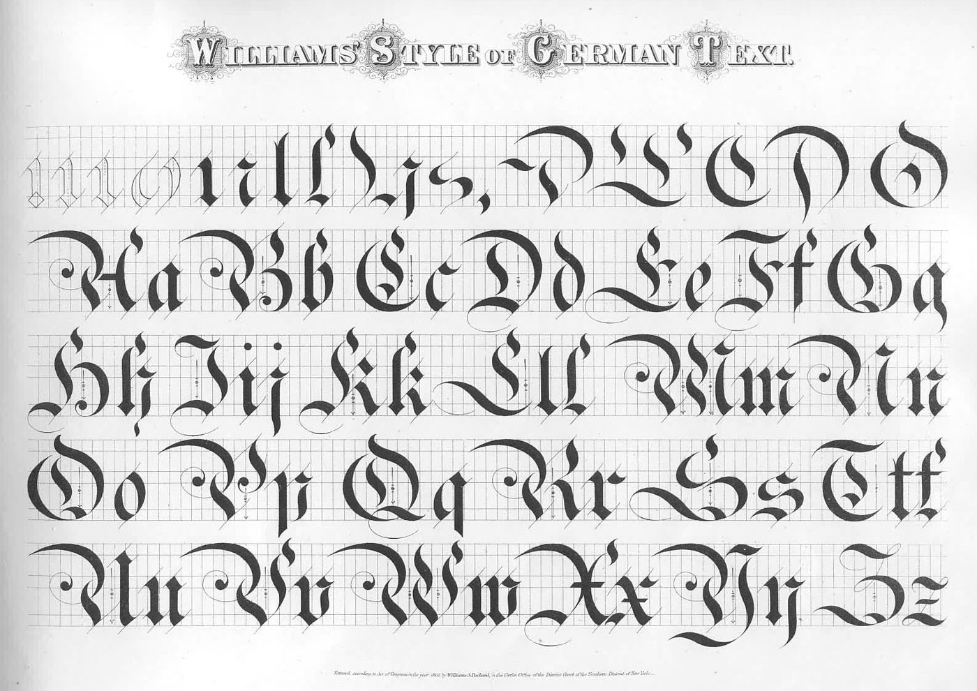 I found a wonderful image that displays a style of Blackletter that I haven’t seen reproduced quite the same anywhere else. The title of the image is “Williams Style of German Text”, which doesn’t seem to bring up much other than the original image, so I don’t have much more information than what you see there. I’m sure there is much to learn in exploring the style, and I’m going to spend the next few weeks trying to understand the intricacies of what makes the letters function in the way they do, but in the mean time, I took some inspiration from the style, as well as several other styles I’ve seen around the web, and came up with the piece above.