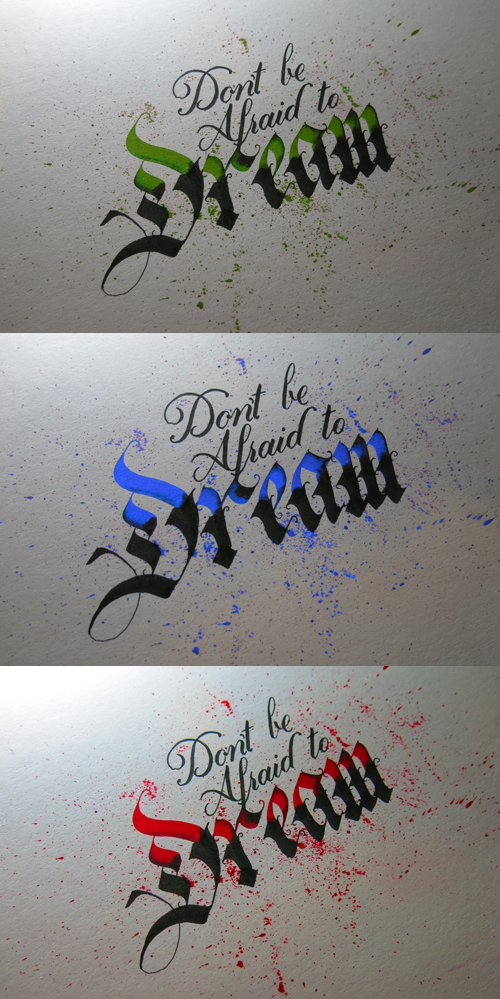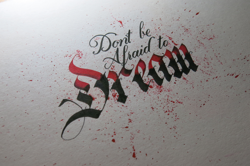 The speckles that surround the letters were made by pulling on the tip of the nib, and letting it go, which flicks the ink on to the paper. Unfortunately, it also flicks it everywhere else, so I ended up with some red fingers, pens and surfaces. Before I did the speckles, I first drew out some guidelines for the word “Dream”, then wrote in the red parts. Once they were dry, I went over in black to complete the bottom part of each letter, then added in the Copperplate above with a brush pen. The speckles came in last because I didn’t want to get my hands so messy if I ended up making a mistake and discarding the paper!