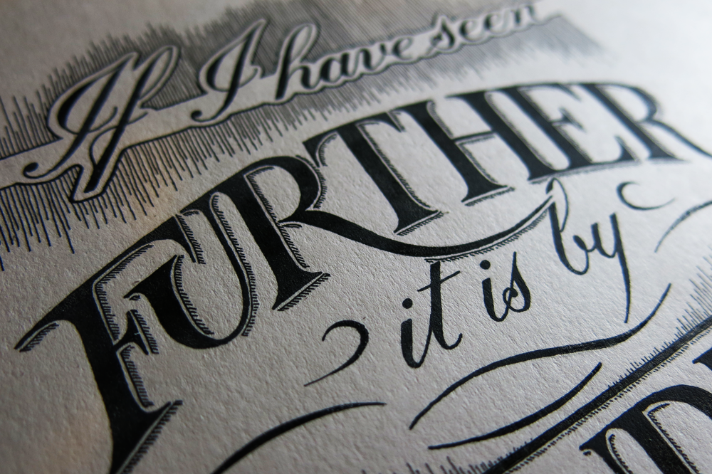 With this piece, I focused my efforts on creating something with a minimum of styles. It’s too easy to get carried away with adding in everything that you’ve learnt, but that often leads to something that is too muddled: something I struggled with in my early pieces, and still do sometimes. Here, however, there are only two styles: Copperplate calligraphy and Roman caps. The challenge then, past restricting myself to the use of only these styles, was to find other ways to explore them. Roman caps, particularly, can seem very much like the basic, standard letter forms, and that’s because they are. Because of that, however, you could say that they are too normal, so I took some inspiration from old sign painters’ inclination to use interesting ligatures to fit words into small spaces, with the U in “Further” tucked under the F, and the OU in “Shoulders” arranged in a little stack.