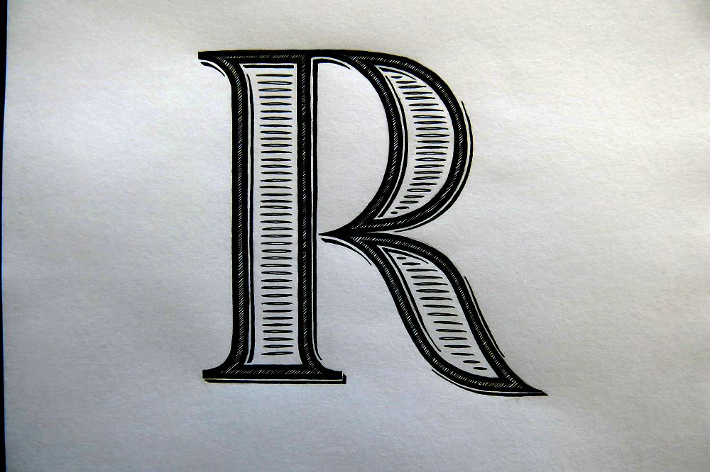 P: This one shares similar ornamentation to the N, but its form is inspired mostly by pointed pen calligraphy rather than Roman caps.