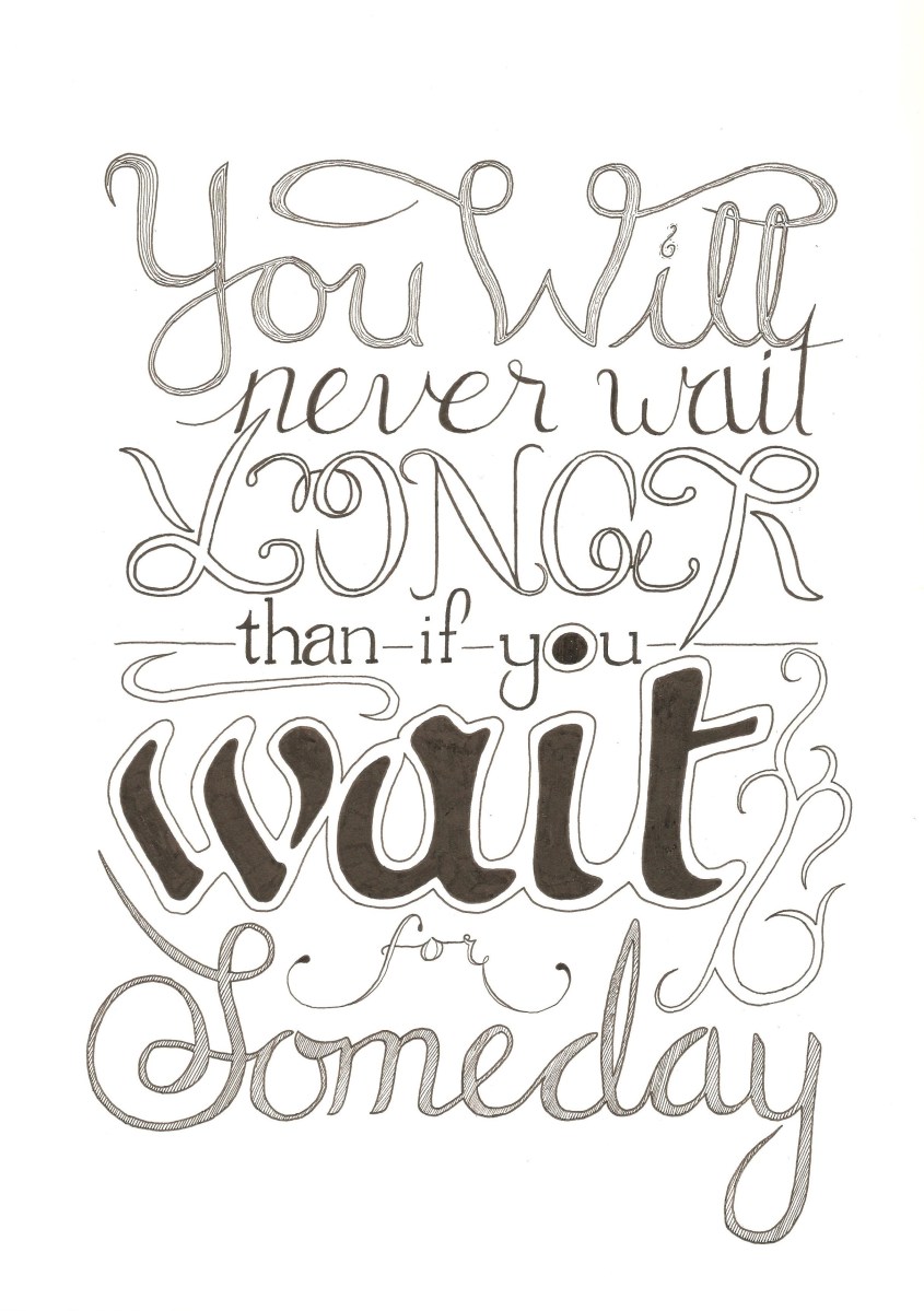 Wait Portrait Published April 21, 2014 at 2423 × 3439 in Lettering ← Previous Next → You will never wait longer than if you wait for someday. Like Loading...