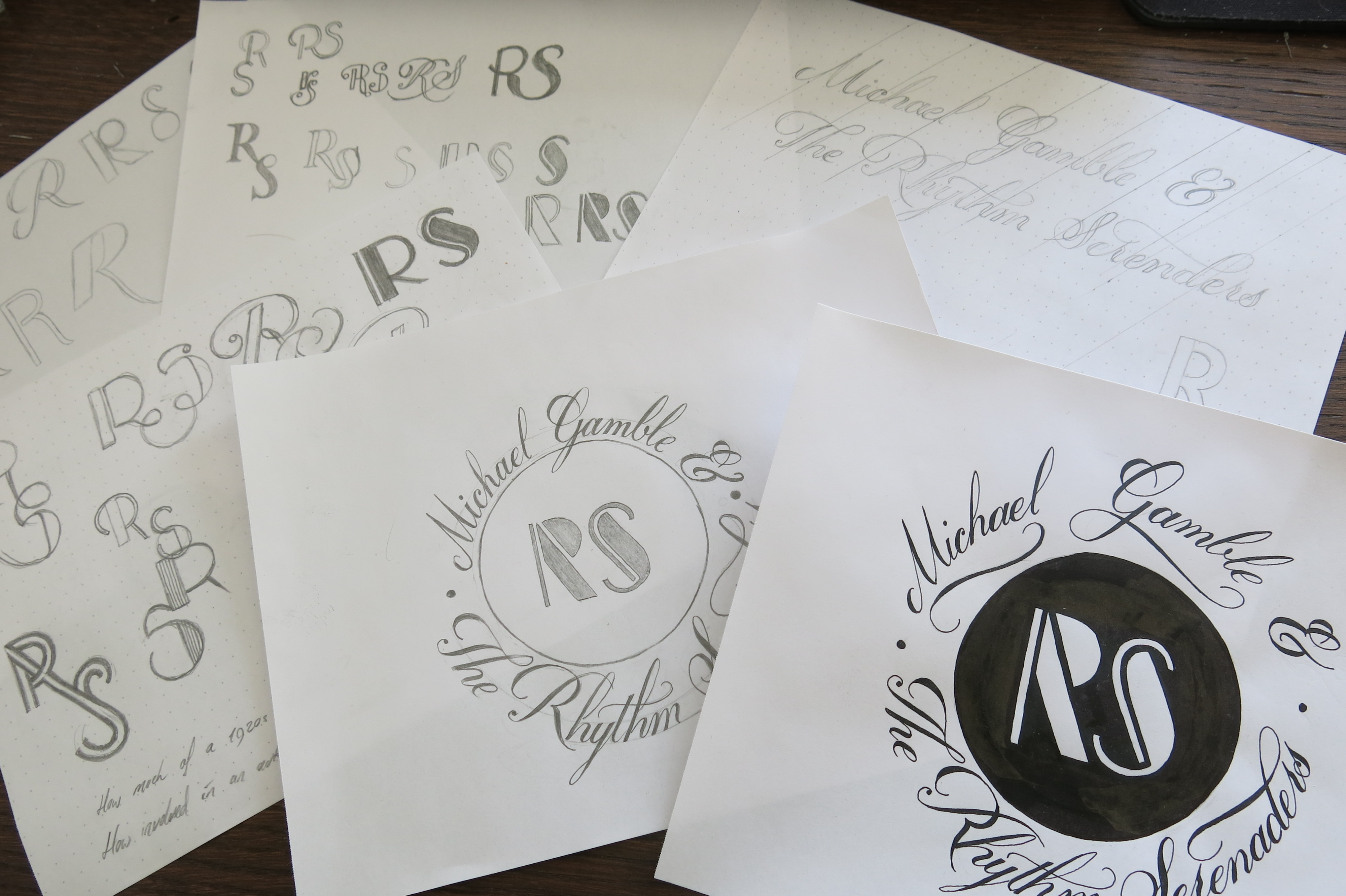 I started with planning out the symmetry in the text across the middle. Having an ampersand and an S next to each other is convenient in that they share similar elements. After several iterations, and having found something I was pleased with, I started work on the other elements. The monogram in the bottom centre is loosely based on the letters from the main text, but needed some obvious adjustments. The flourishes at the top also lead to a fun design in the middle: a bike made of flourishes. After planning the ribbons, I also worked in some additional flourishes in the negative space below the main text.