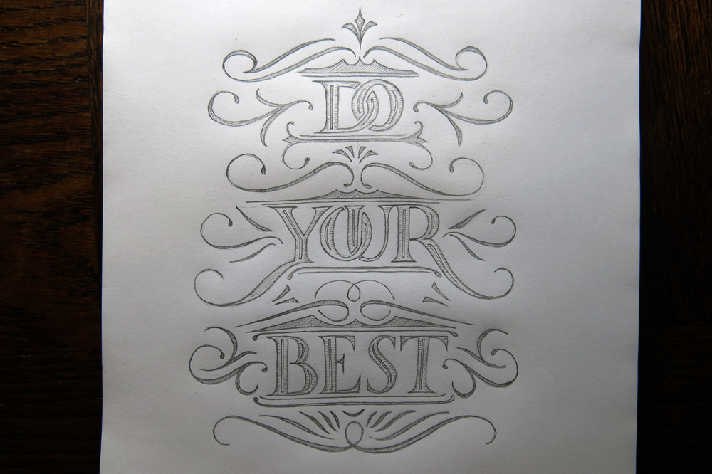 Lately, I have been working on composing pieces with more ornamentation and flourishes. My goal has been to get a better understanding of how to create lettering pieces that aren’t based solely on the letter forms and the shapes of the words. Doing a daily doodle has given me some nice time to focus on exploring different options, and so for this week’s piece, I’ve used one of my daily designs.
