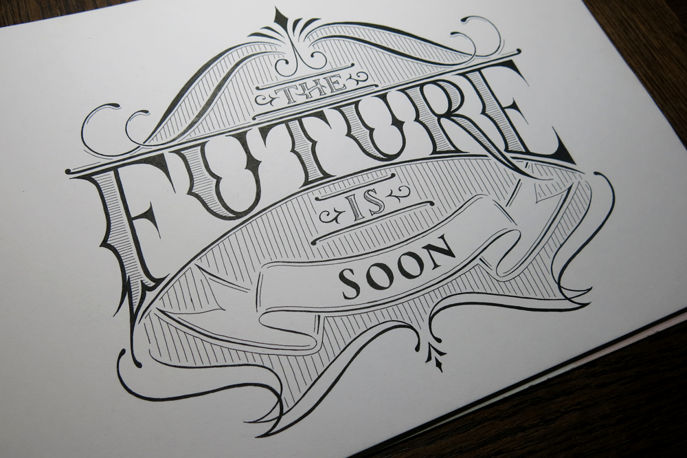 “The Future is Soon.” The sketch I made into an inked piece today.